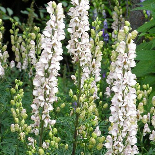 Саженцы Аконита (Борца) клобучкового Альбум (Album) привлекательны внушительными размерами, неприхотливостью и универсальностью. Травянистый многолетник одинаково хорошо растет на солнце и в тенистом цветнике. На прямостоячих прочных стеблях, высотой до метра, распускаются многочисленные белоснежные цветочки удивительной формы: верхние широкие лепестки соединены в подобие капюшона, нижние остаются раскрытыми. Размер каждого бутона не превышает 3 сантиметров. Цветение обильное, с июля по конец сентября. Размещая цветок в саду, необходимо помнить, что аконит ядовит. Растение зимостойко, но нуждается в плодородной почве.
