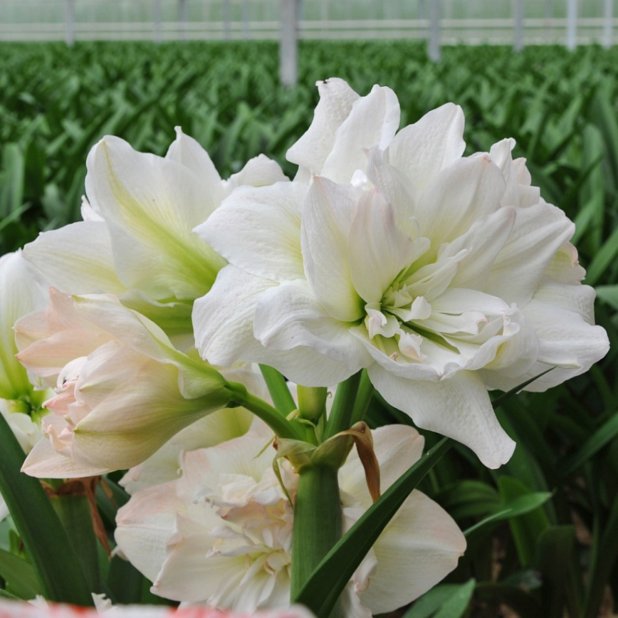 Амариллис махровый арктик нимф - это великолепное растение, которое поразит вас своей красотой и изяществом. Его ствол прочный и устойчивый, достигает высоты до 70 см, а его листья имеют элегантную форму и насыщенный зеленый цвет. Цветки амариллиса махрового арктик нимф белые с розоватым отливом, что создает неповторимый и нежный образ.