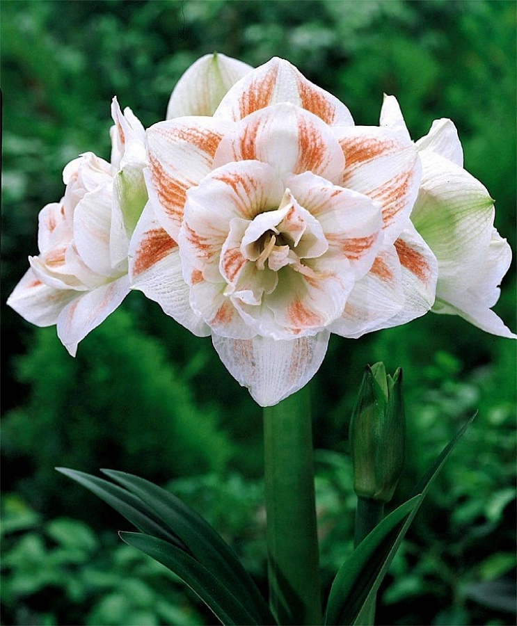 Амариллис махровый нимф - это волшебное растение, которое поразит вас своей красотой и изяществом. Его ствол устойчивый и прочный, достигает высоты до 70 см, а цветки белого цвета с розовым штрихом просто завораживают своей нежностью. Листья амариллиса имеют элегантную форму и придают растению особый шарм.