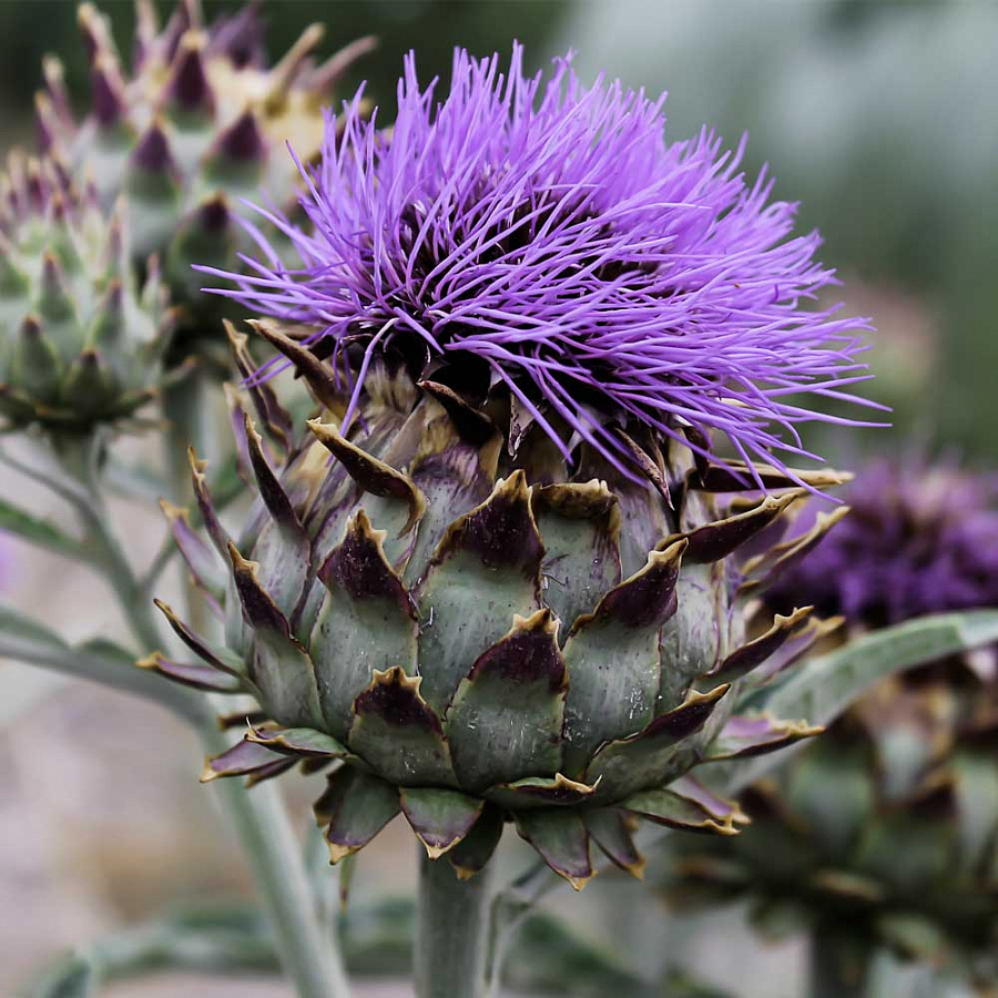 Саженцы артишока испанского имеет высокие декоративные качества благодаря своим большим, колючим, почти в форме кинжала серо-зеленым листьям. Цветоносные стебли в середине лета украшаются круглыми, фиолетовыми цветками. Многолетник может разрастаться до 50 см в высоту .Сорт саженцев артишока испанского уникален тем, что используется не только для озеленения участка, но и в кулинарии (в пищу употребляются розетки прикорневых листьев, цветочные корзинки и стебли). В уходе многолетник нетребователен, к засухе устойчив.