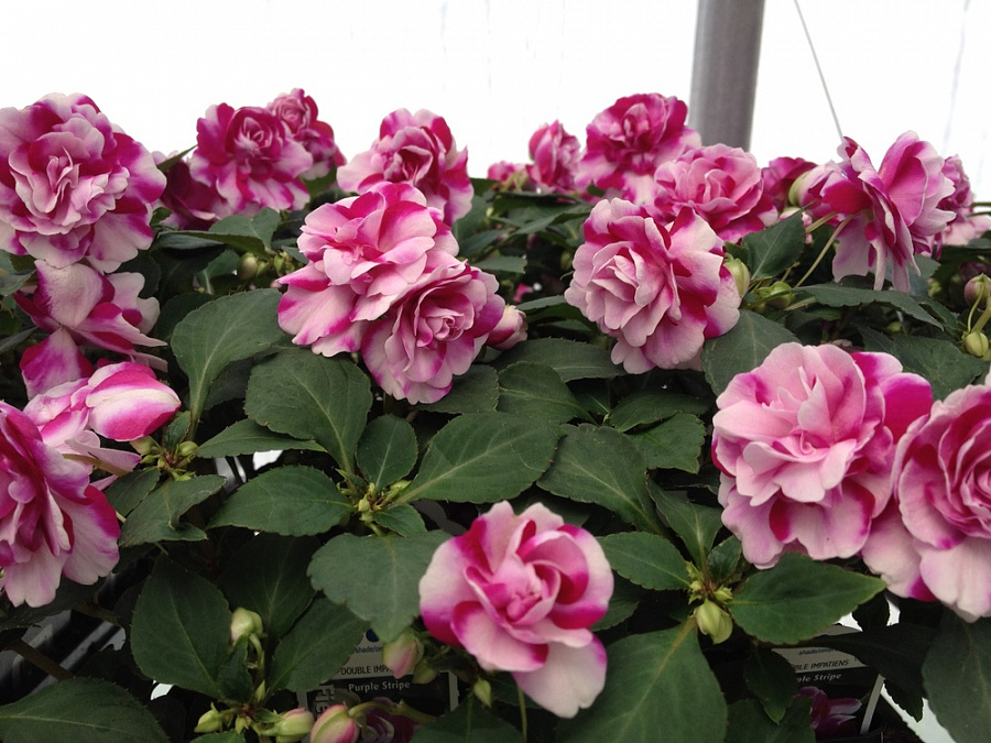 Рассада Бальзамина (Импатиенс) Уоллера Фиеста Бонита Парпл Страйп (Fiesta Bonita Purple Stripe) предназначена для высадки в цветник, выращивания в вазонах, кашпо. Главное достоинство сорта – обильное и продолжительное цветение. Уже в июне на кустиках раскрываются первые махровые бутоны. Шелковистые лепестки окрашены ярко, в белый и вишнево-красный цвет. Цветение длится до 6 месяцев в домашних условиях, в открытом грунте – до первых заморозков.