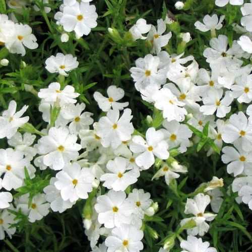 Саженцы флокса шиловидного Маичне (Phlox subulata Maischnee) – многолетний быстрорастущий сорт. Зелени на подушковидных кустах практически не видно из-за обильного цветения. Используют для образования вечнозеленого ковра. Одно растение разрастается до метра в диаметре, в высоту не превышает 15 сантиметров. Листочки зелено-серые, острые, до 5 сантиметров. Цветет первый раз в конце лета, повторно – в начале осени. Небольшие цветочки колосовидной формы, диметром до 1,5 сантиметров чистого белого цвета. Цветение очень плотное. Растение хорошо переносит засуху, но не любит застоя воды. Хорошо развивается на сухих бедных почвах.