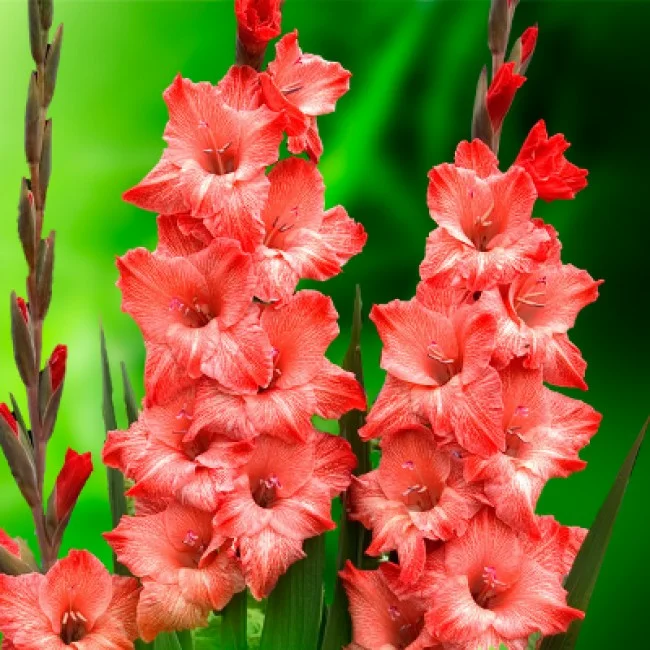 Луковицы гладиолуса гибридного Berlusconi используют для создания ярких цветников, расположенных на хорошо освещенных или частично затененных участках. Место следует выбирать таким образом, чтобы не было сквозняков. К почве культура неприхотлива. Высота стеблей гладиолуса гибридного Berlusconi достигает до 80-150 см. Большая часть из этой длины – мощные соцветия. Цветы крупные, красивой розово-лососевой окраски с небольшим белым бликом по центру лепестка. Смотрятся такие композиции очень красочно. Цветение продолжается с июля до сентября и сопровождается приятным цветочным ароматом.