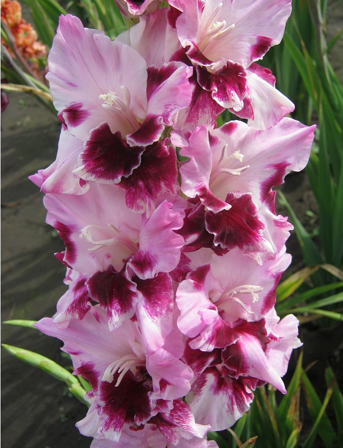 Луковицы гладиолуса гибридного Love широко популярны среди садоводов благодаря потрясающему декоративному виду во время цветения. Растения довольно мощные, в высоту достигают до 150 см. Большая часть стебля представлена пышным соцветием. Цветочки крупные, нежно-сиреневые с красивыми темно-розовыми пятнами на одном-двух лепестках. Такая окраска выигрышно смотрится на фоне насыщенно-зеленой листвы. Высаживать гладиолусы гибридные Love рекомендуют на солнечные или частично освещенные участки, с питательным, рыхлым грунтом.