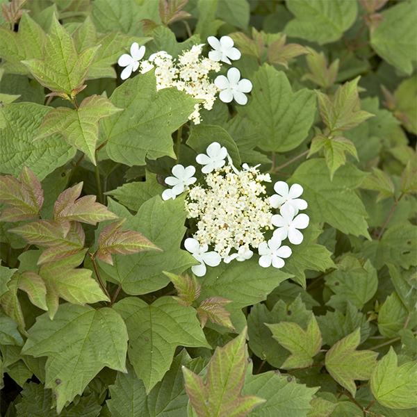 • Калина компактная – карликовая разновидность Калины обыкновенной; это кустарник высотой 0,5-0,8 м, с густой кроной из 3-5-лопастных листьев, цветущий в конце мая бело-розовыми цветами с характерным запахом;