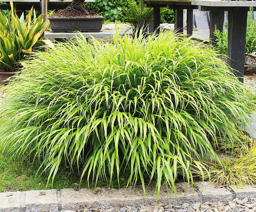 Саженцы Хаконехлоа большой Nicolas (Hakonechloa macra) – экзотическая травянистая культура семейства Злаки из японских лесов. Многолетнее медленнорастущее растение высаживают на тенистых участках, так как прямой солнечный свет приводит к быстрому пересыханию надземной части. Насыщенность цвета вечнозеленых листьев Hakonechloa macra также меняется в зависимости от освещения. В тени листва темно-зеленая, но бледнеет по мере насыщения светом. По внешнему виду листья напоминают бамбук и склоняются к земле, формируя куст округлой формы. Высота растения колеблется в пределах 340-40 см, диаметр – 40-50.