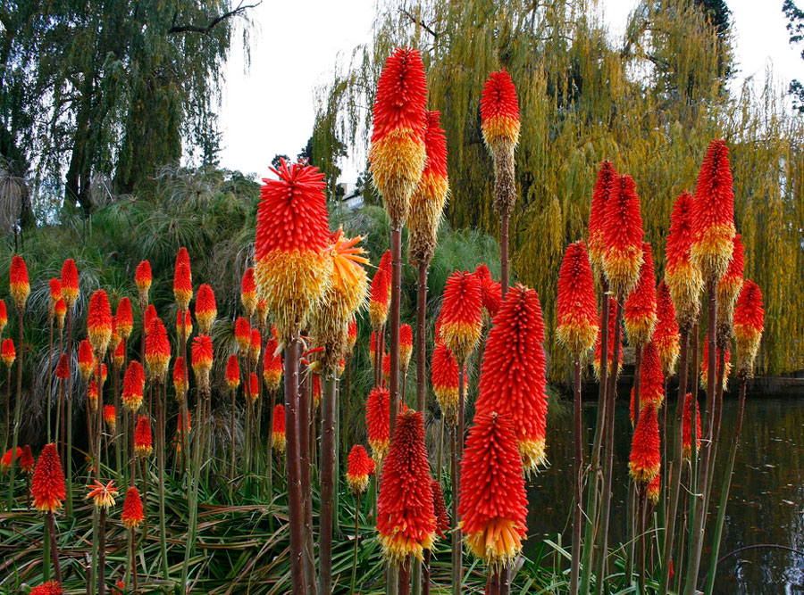 Рассада Книфофии ягодной очень разнообразна: у каждого вида свой цвет соцветий. У книфофии толстый корень. Листья длинные, расположены около корня. Цветы маленькие, собранные в густые соцветия-колоски. Имеется цветонос. Цветёт всё лето и в начале осени. Сначала цветут нижние цветки, а потом постепенно цветут верхние. Плод книфофии ягодной — коробочка, в которой находятся семена. Особенности ухода: