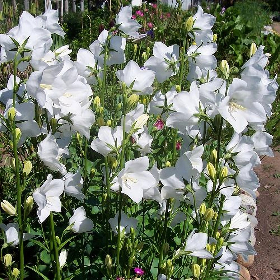 Колокольчик персиколистный такион вайт - это изысканное растение снежно-белого цвета, которое поражает своей красотой и изяществом. Сорт takion-vayt отличается высотой 40-60 см и крупными цветками до 5 см в диаметре. Листья темно-зеленые, а цветки собраны в длинные метелки на верхушках стеблей. Этот колокольчик идеально подходит для групповых посадок в саду, создавая неповторимый акцент и придавая уютную атмосферу.