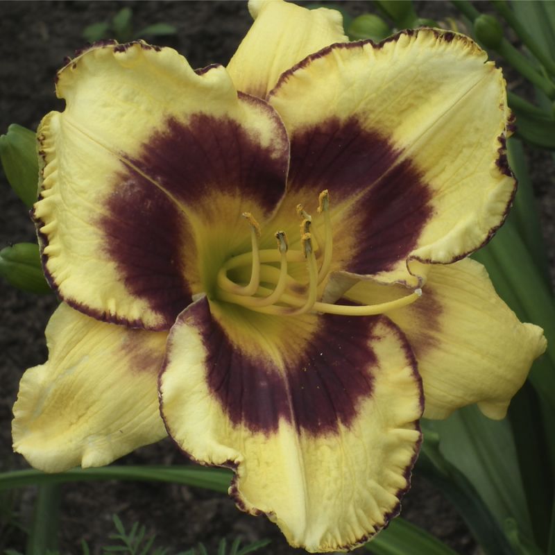 • Окраска цветка : Жёлтая с винно-пурпурным глазком и каймой, жёлтое горло