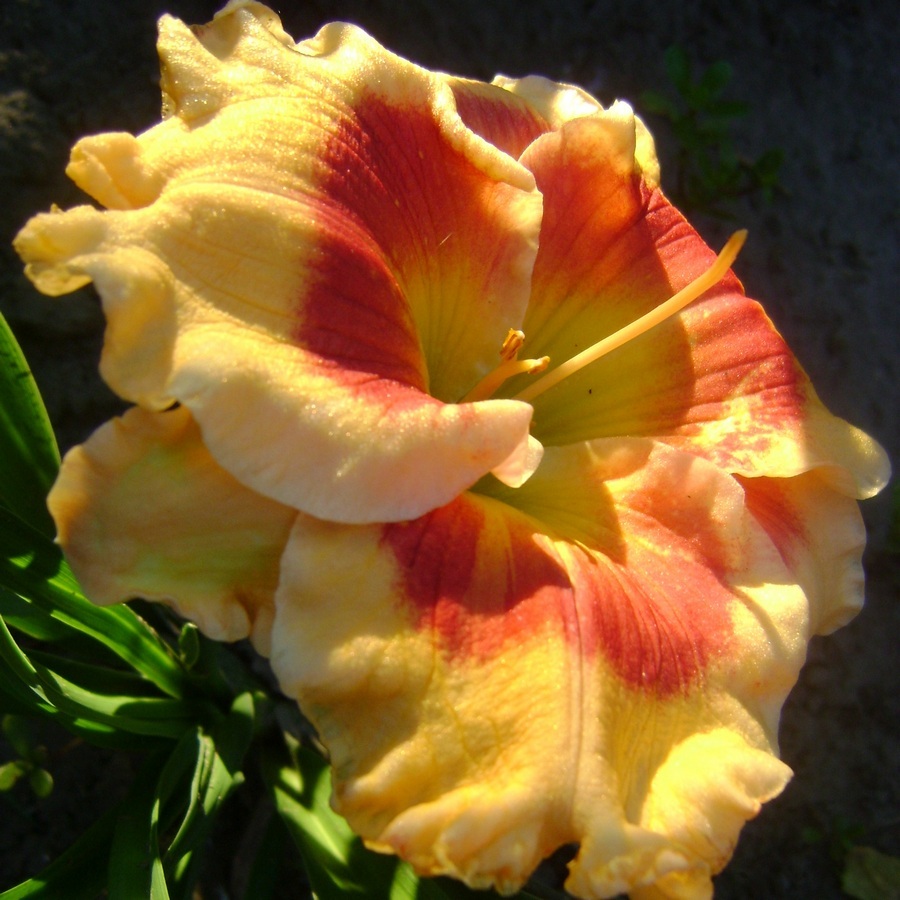 Саженцы и рассада Лилейника гибридного Икс Фактор (Hemerocallis) подойдут всем, кто хочет ежегодно наблюдать цветение одного из наиболее продуктивных сортов. Цветы у него яркие, в теплый тонах. Лепестки горчично-желтые, с лилово-красной каймой вокруг сердцевины. Они легкие и гофрированные, при этом прочно держатся и долго не осыпаются (до 6 дней).