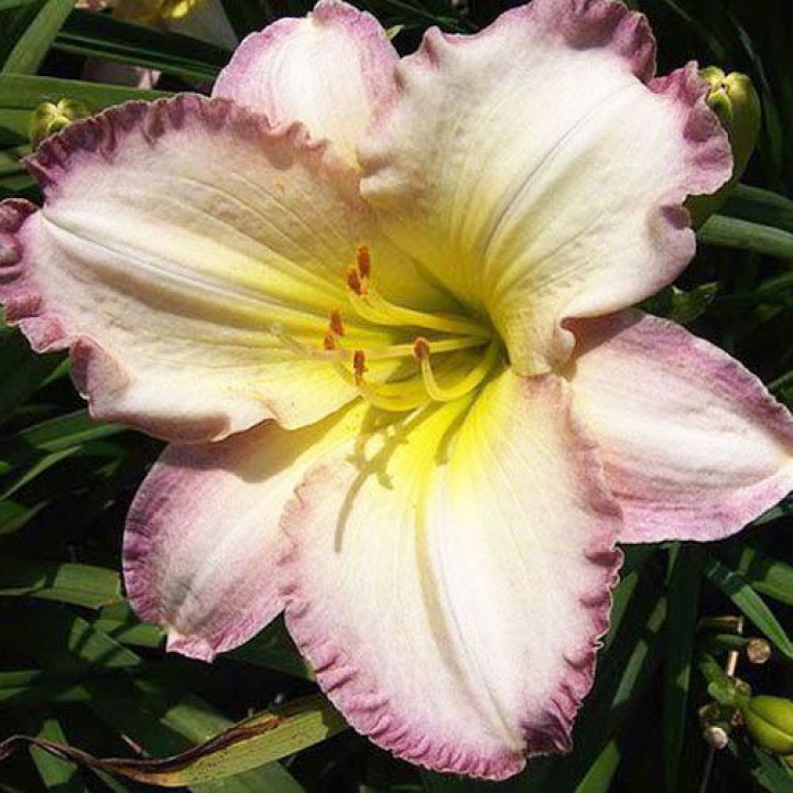 • стойкость к болезням и вредителям. Цветки лилейника Сил оф Эпрувел имеют белые лепестки с тонким гофрированным краем лавандового оттенка, горло бутона при этом яркое, зелено-желтое. Цветение куста продолжительное и обильное, на одном цветоносе одновременно распускается несколько крупных бутонов, создавая прекрасную ветку для букета.