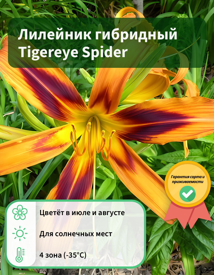 Рассада лилейника "Тайгерай Спайдер" (Tigereye Spider) станет украшением любого участка. Многолетник неприхотлив в уходе, а высаживать его можно практически на любые участки. Но чтобы достичь наиболее обильного и яркого растения, требуется рассаду лилейника "Тайгерай Спайдер" высаживать на хорошо освещенные либо частично затененные места. Высота многолетника примерно 70-80 см. Цветок бронзово-оранжевый с черно-оранжевым глазком и горлом, меняющим цвет от золотистого до зеленого. Лепестки достаточно тонкие, отчего растение приобретает легкий ажурный вид.