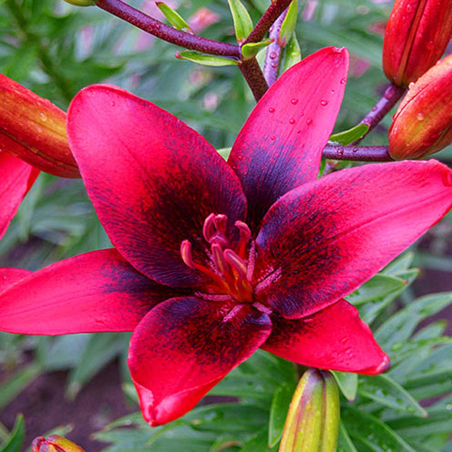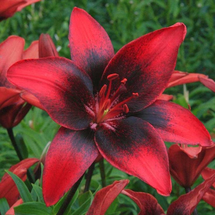 Луковицы Лилии азиатской Танго Лондон Харт (Lilium asiatic London Heart) станут прекрасным растением, сочетающим в себе красоту, изящество и безупречность форм. Сорт с характерным для группы «танго» крапом контрастного цвета, как и другие представители, отличается неприхотливостью и стойкостью к самым суровым морозам. Лондон Харт особенно ценится за свой насыщенно-красный цвет и плотное напыление в центре глубокого темно-фиолетового оттенка. Выберите для красавицы достойное место в саду, и она будет радовать вас много лет, не требуя повышенного внимания.