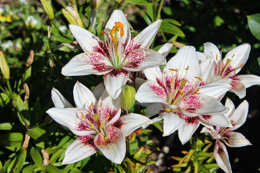 Окраска цветка : белый с густым вишневым крапом до середины лепестков