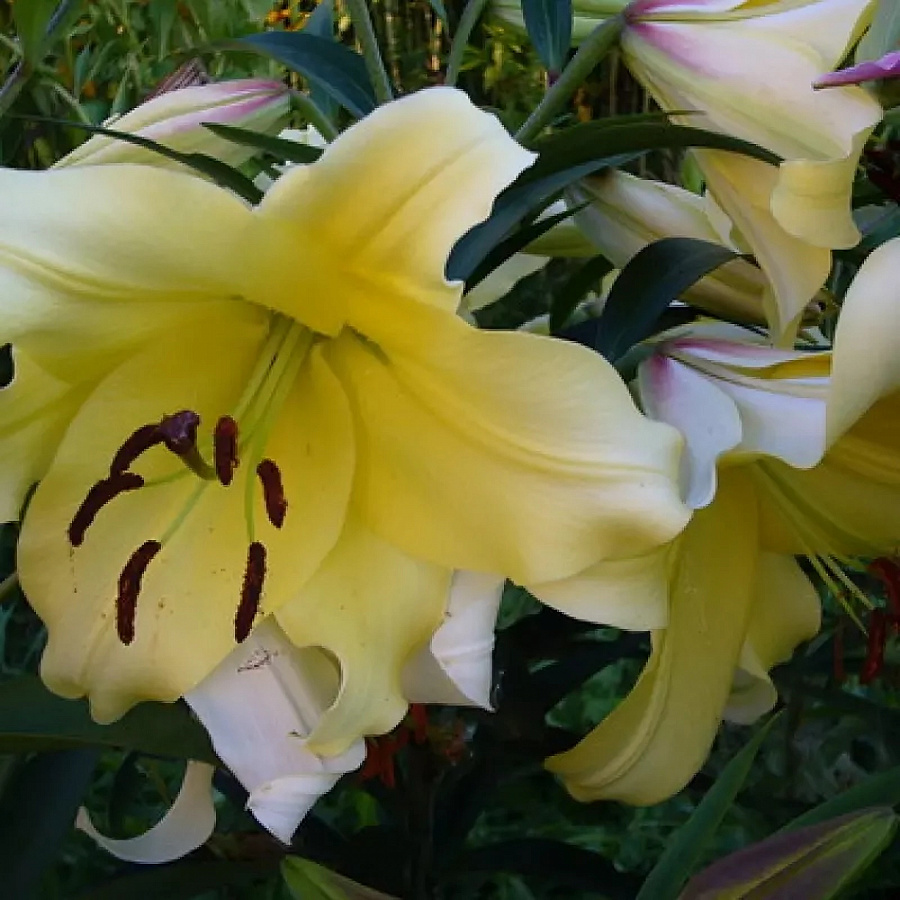 Луковицы лилии ОТ-гибрид Лесото (Lilium OT-hybrid Lesotho) к середине лета принесут в сады и клумбы крупные, до 22 см в диаметре, яркие желтые цветы. На основании лепестка есть легкий зеленоватый оттенок и с обратной стороны каждого – узкий фиолетовый мазок, в остальном окрас лепестков чистый, без крапа и примесей. В период цветения фиолетовые блики будут видны, так как головки раскрываются вниз и в стороны от цветоноса. Пыльники крупные, контрастные, кирпично-коричневого цвета. Растение меняет высоту с годами и на 3-5 год достигает 150 см. Декоративный многолетник трепетно относится к освещенности места посадки и требует плодородных влажных почв с хорошим дренажем.