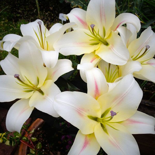 • Окраска цветка : белый с желтоватым центром, со светло-малиновыми продольными мазками по центру лепестков и темными пыльниками