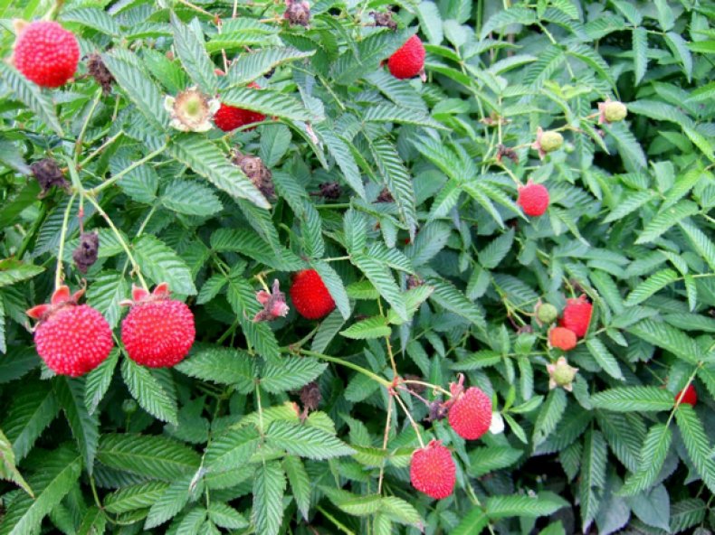 Саженцы малины розолистной (Rubus Illecebrosus) высаживают в дренированный плодородный грунт на солнечном участке сада. Взрослый куст достигает 90-100 сантиметров в высоту. Весной распускается белыми цветами, а летом активно плодоносит. Характеризуется высокой декоративностью. Гофрированные листья и ярко-бордовые ягоды, размером до 3 сантиметров, станут украшением участка. Плоды отдаленно напоминают клубнику, но на малину все-же похожи больше. Цветы распускаются одновременно с созревающими ягодами, которые всегда предпочитают «смотреть» вверх, не скрываясь под листвой.