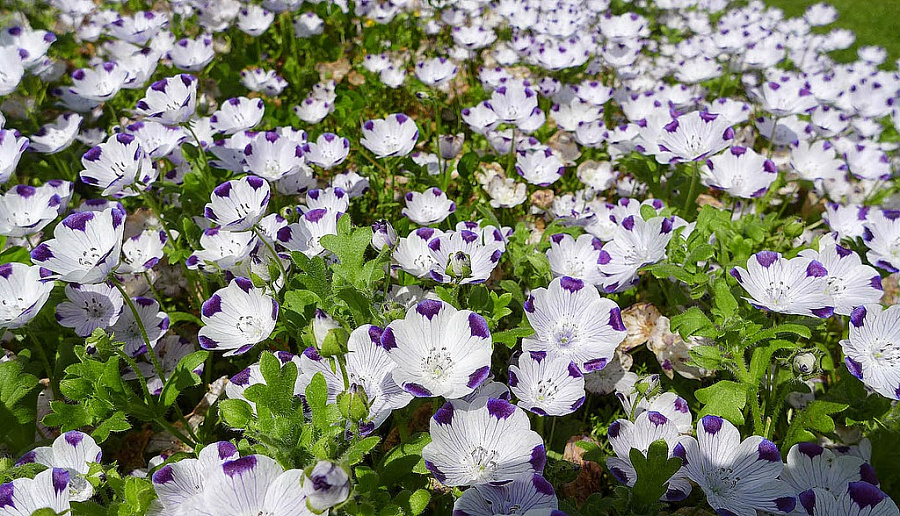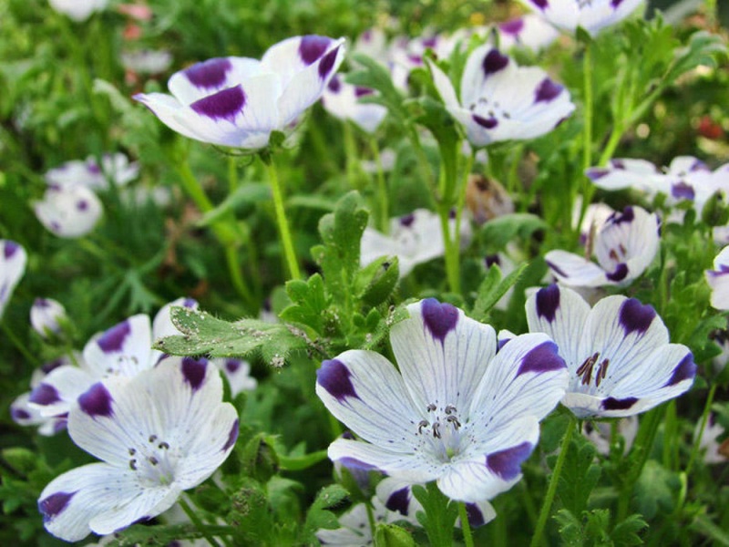 Семена  немофилы пятнистой (Nemophila maculata) Божья коровка высевают в открытый грунт в апреле, и уже в июне любуются красивоцветущей полянкой. Однолетнее почвопокровное растение низкое, высотой до 20 сантиметров. Стебли разветвленные, полустелющиеся. Листья перистолопастные, опушенные. Нежные цветки немофилы пятнистой похожи на крупные лютики. На конце каждого белого лепестка имеется по одному синему или лиловому пятнышку, отсюда и оригинальное название сорта — «Божья коровка». Любит полутень и влажную почву. Особенно эффектна в бордюрах, в подвесных контейнерах и вблизи водоемов.