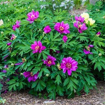 Рассада пиона ИТО Монинг Лилак (Morning Lilac) будет хорошо развиваться даже у начинающего садовода. Ярко-лиловые полумахровые цветы добавят оживления и цвета. В центре соцветий расположены желтые пыльники, контрастирующие с кудрявыми лепестками. Диаметр цветков до 15 см. Могут завязываться семена. Основание кустов – плотный ствол, покрытый корой. Стебли прямые и прочные. Рассаду не рекомендуется высаживать возле деревьев – корни будут страдать от дефицита влаги и питательных веществ. Особенности пиона Монинг Лилак: