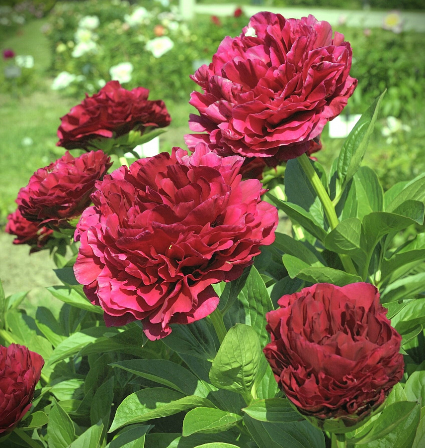 - Пионы используются для посадки многолетних клумб или создания групп растений. Они хорошо сочетаются с лилейниками, астрами или другими луковичными растениями.