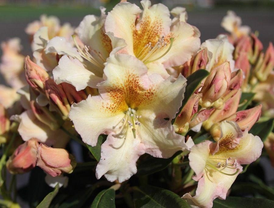 Вечнозелёный низкий густой кустарник шаровидной, слегка приплюснутой формы. Растёт медленно, после 10-ти лет высота 50-60 см и ширина 80 см. Бутоны розово-лососёвые. Цветки диаметром 5 см, жёлто-кремовые с оливково-зелёным рисунком на верхнем лепестке и контрастными тёмно-розовыми тычинками. Цветение обильное в начале мая. Листья ланцетные, кожистые, тёмно-зелёные слегка блестящие. Морозостойкость до -23ºС.