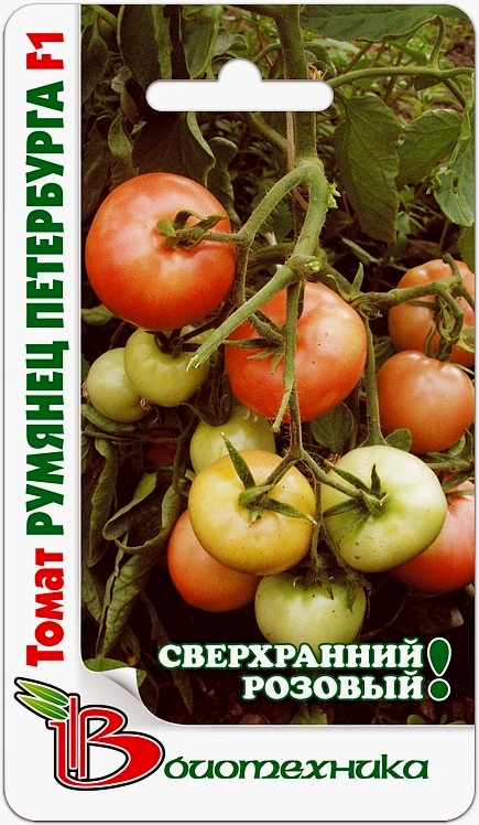 Семена томата "Румянец Петербурга F1" (Rumianetc Peterburga F1) – это сверхранний гибридный сорт. На рассаду посев производят в апреле. Спустя 80-85 дней после появления всходов начинается массовый сбор урожая. Плоды округлые, слегка уплощенные, у плодоножки нет зеленого пятна. Кожица плотная, равномерного розового окраса. Средняя масса 120-140 грамм. Обладает ярким ароматом и неповторимым вкусом. Сорт отличается стойкостью к самым распространенным заболеваниям. Универсален в использовании, подходит для потребления в свежем виде и приготовлении домашних заготовок.