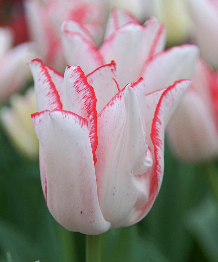 Тюльпан Триумф Бьюти Тренд - это великолепное растение с крупными бокаловидными бутонами белого цвета, украшенными яркой розовой каймой. Этот сорт тюльпанов поражает своей изысканной красотой и неповторимым шармом. Высота растения достигает до 55 см, что делает его идеальным для групповых и одиночных посадок в саду или на клумбе.