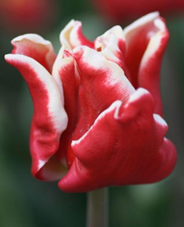 Тюльпан Триумф Элегант Краун - это изысканное растение с красивыми красно-кремовыми цветками, украшенными изогнутыми кончиками лепестков. Его стебель достигает высоты до 55 см, что делает его идеальным для групповых и одиночных посадок в саду. Листья тюльпана зеленеют весной, создавая яркий контраст с яркими цветами.
