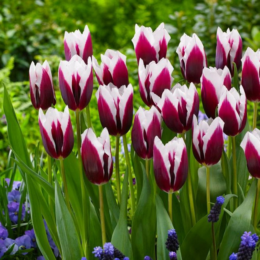 Тюльпан Триумф Шпицберген - это великолепное растение с бордовыми цветками, украшенными широким белым краем. Его стебель достигает высоты до 45 см, что делает его идеальным выбором для групповых и одиночных посадок. Листья тюльпана имеют травянистую форму, что придает растению особый шарм.