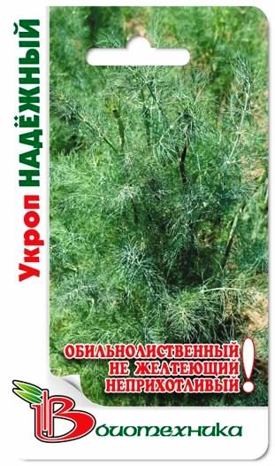 Семена укропа "Надежный" (Nadezhnyj) высевают под зиму или ранней весной. Это компактный, очень ароматный, холодостойкий, среднеспелый сорт. Период от всходов до уборки на зелень составляет 25-40 дней, а на специи – от 60 до 100 дней. Листы зеленого цвета, слегка вытянутые, среднерассеченные по форме, покрытые небольшим восковым налетом, с богатым ярко-выраженным ароматом. Зеленная масса отлично подходит как для употребления в свежем виде, так и для изготовления специй и приправ. Растение устойчиво к стеблеванию. Урожайность на зелень составляет 1,9-2,3 кг с 1 кв. м.